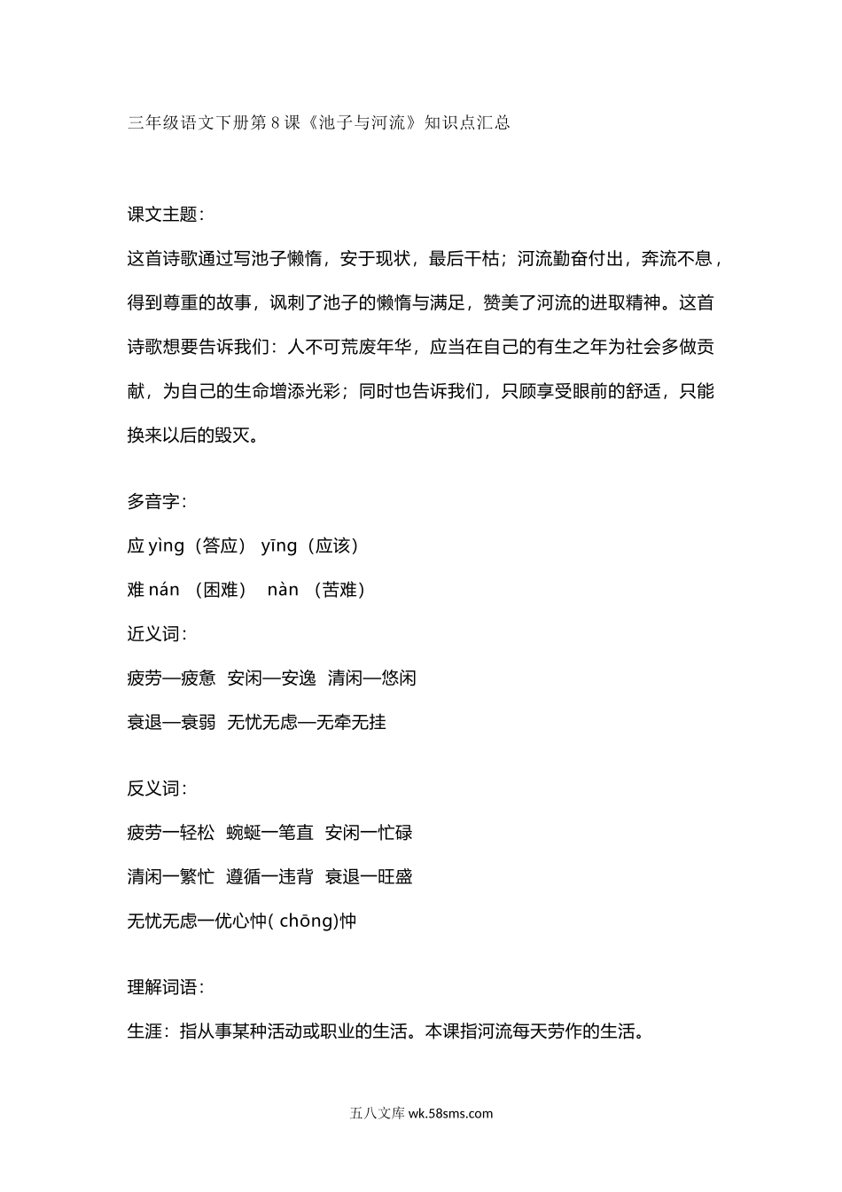 小学三年级语文下册_3-8-2-1、学习资料、复习、知识点、归纳汇总_部编版_部编版语文三年级下册:第8课《池子与河流》课文主题总结和生字解读.docx