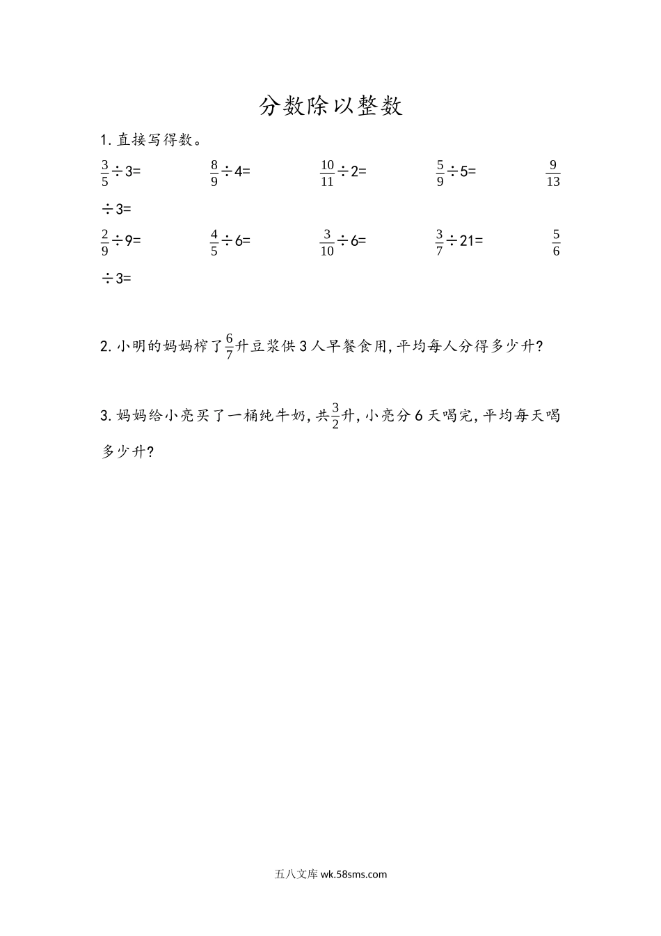 分数除以整数1.直接写得数。35÷3=89÷4=1011÷2=59÷5=913÷3=29÷9=45÷6=310÷6=37÷21=56÷3=2.小明的妈妈榨了67升豆浆供3人早餐食用,平均每人分得多少升?3.妈妈给小亮买了一桶纯牛奶,共32升,小亮分6天喝完,...