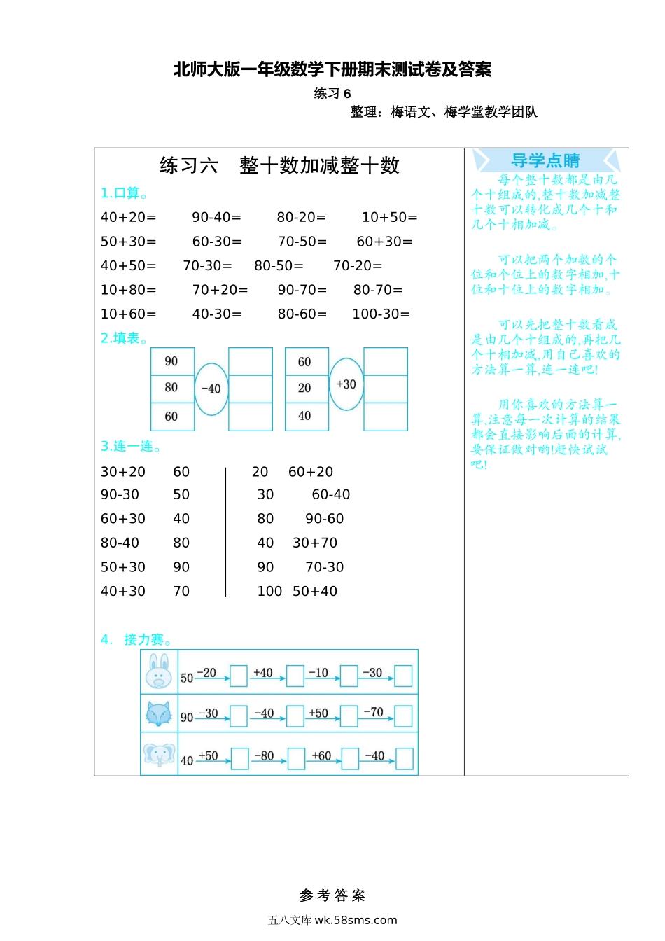 北师大版一年级数学下册期末测试卷及答案练习6整理:梅语文、梅学堂教学团队参考答案五八文库wk.58sms.com练习六整十数加减整十数1.口算。40+20=90-40=80-20=10+50=50+30=60-30=70-50=60+30=40+50=70-30=80-50=70...