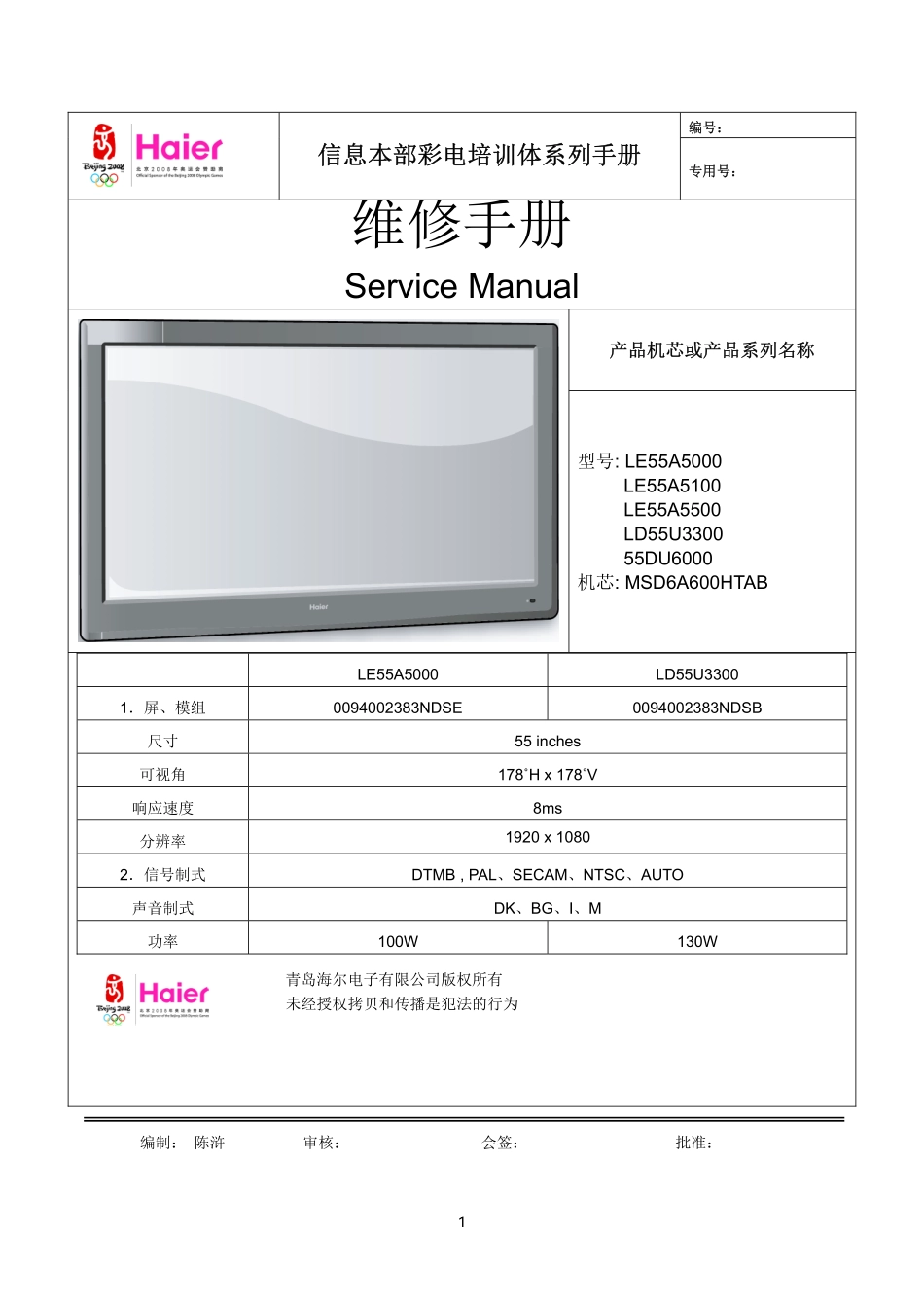 海尔LE55A5000液晶电视维修手册.pdf_第1页