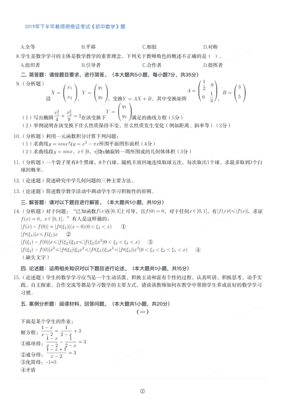 2019年下半年教师资格证考试《初中数学》题.pdf_第2页