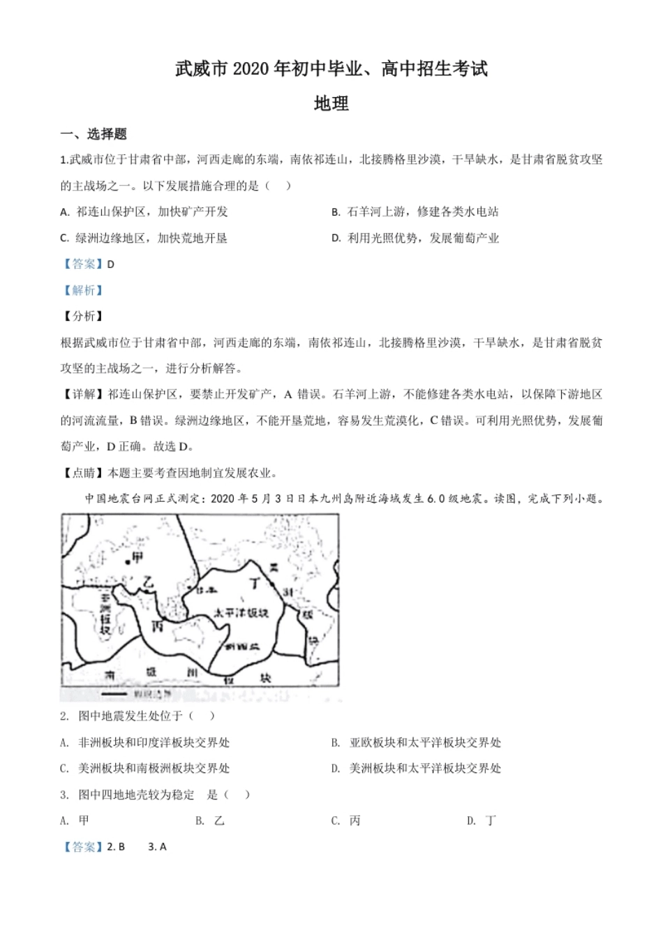 精品解析:甘肃省武威市2020年中考地理试题(解析版).pdf_第1页