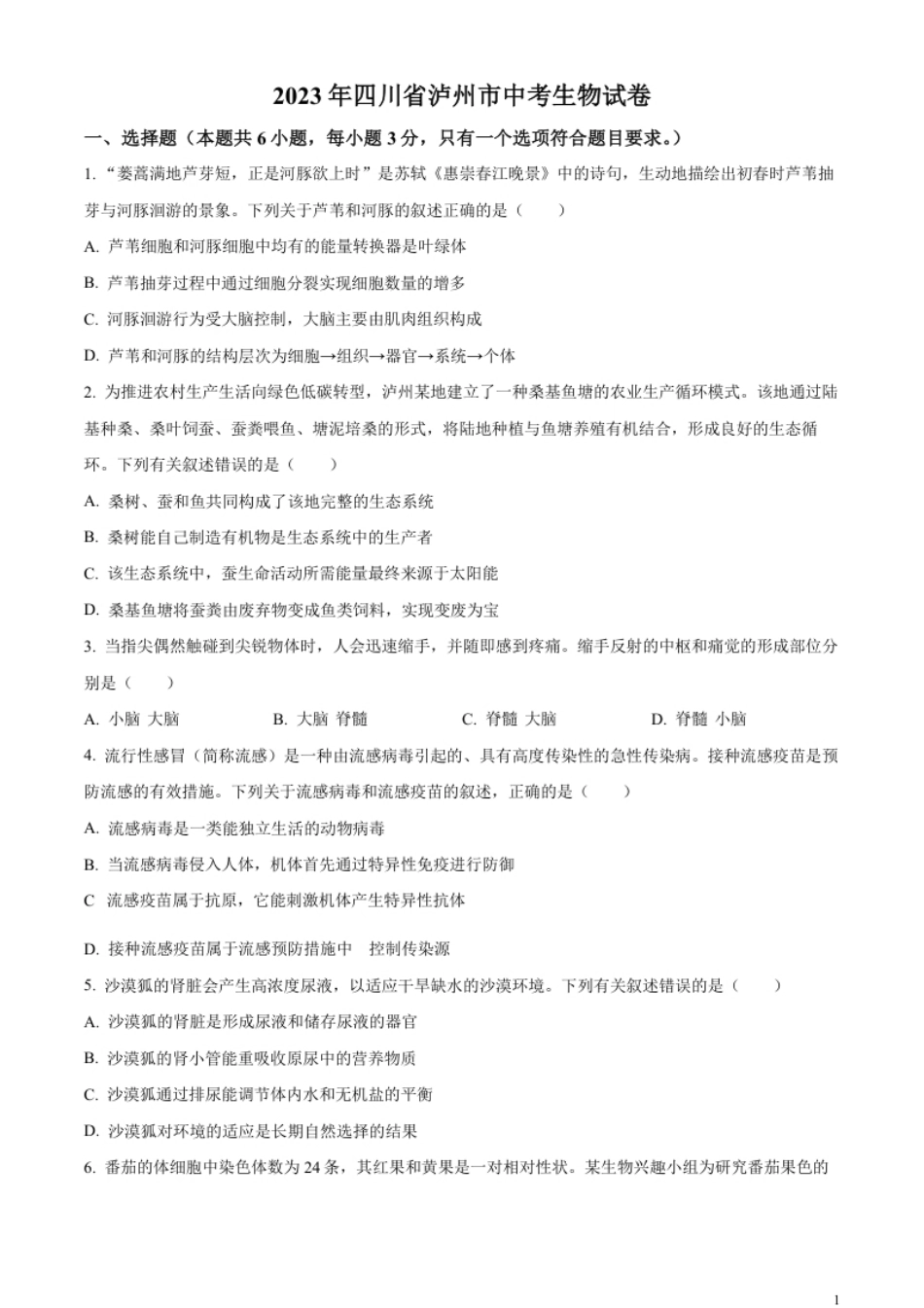 精品解析:2023年四川省泸州市中考生物真题(原卷版).pdf_第1页