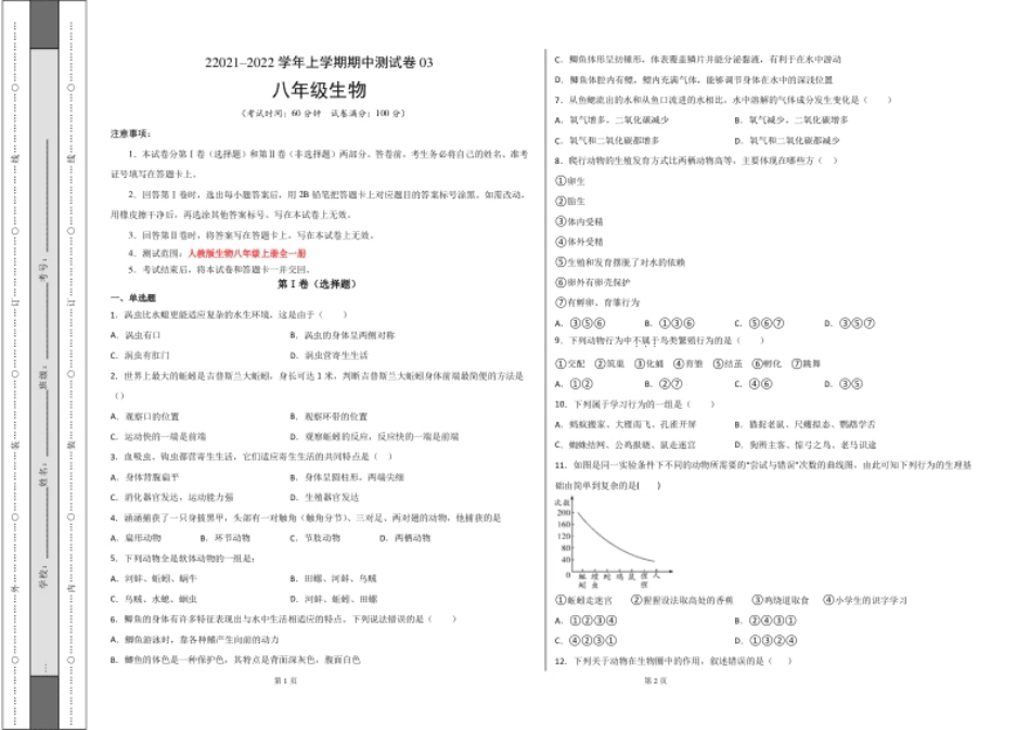 学易金卷:2021-2022学年八年级生物上学期期中测试卷(人教版)03(考试版).pdf_第1页
