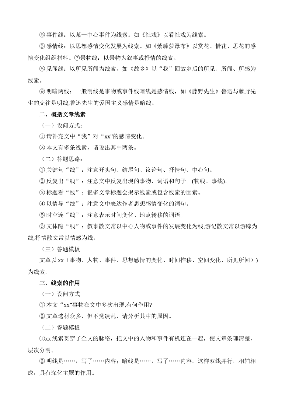 2024年中考语文一轮复习知识清单专题04:记叙文阅读(四)(两大考点:线索作用词语含义)考点16:文学作品阅读之分析线索作用【考点分析】线索,指事情可寻的端绪、路径,或贯穿于整篇文章的思路、脉络等。在写...