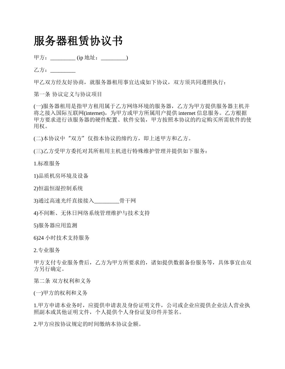 服务器租赁协议书甲方:_________(ip地址:_________)乙方:_________甲乙双方经友好协商,就服务器租用事宜达成如下协议,双方须共同遵照执行:第一条协议定义与协议项目(一)服务器租用是指甲方租用属于乙方网络...