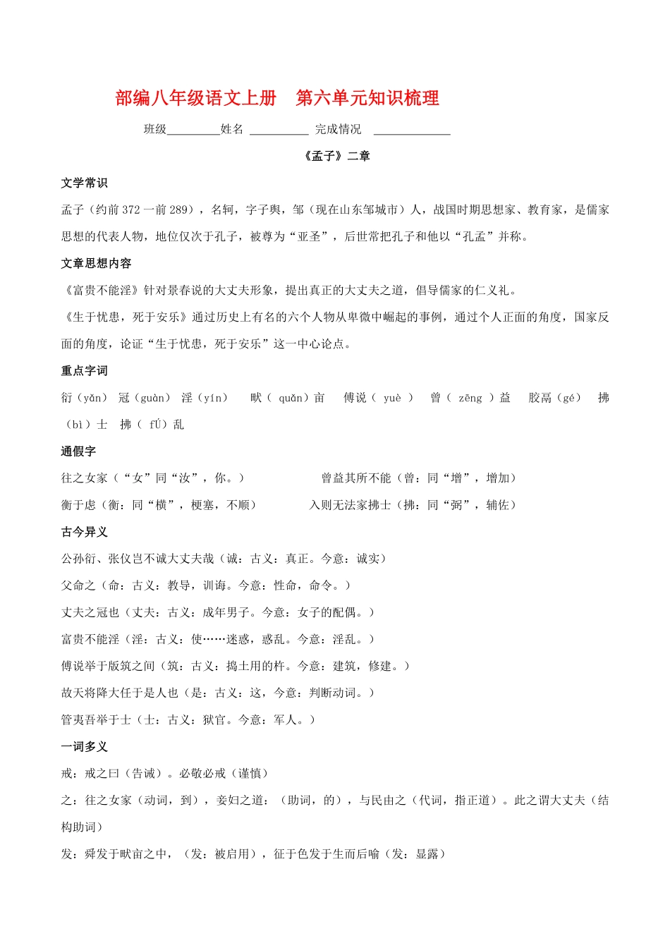 部编八年级语文上册第六单元知识梳理班级姓名完成情况《孟子》二章文学常识孟子(约前372一前289),名轲,字子舆,邹(现在山东邹城市)人,战国时期思想家、教育家,是儒家思想的代表人物,地位仅次于孔子,被...
