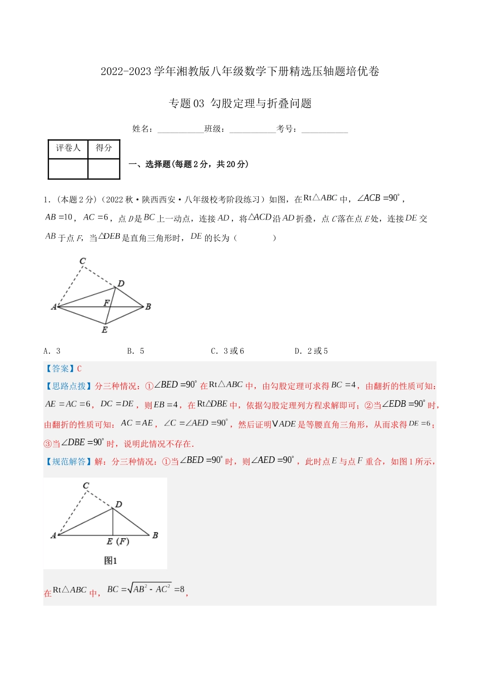 2022-2023学年湘教版八年级数学下册精选压轴题培优卷专题03勾股定理与折叠问题姓名:___________班级:___________考号:___________评卷人得分一、选择题(每题2分,共20分)1.(本题2分)(2022秋·陕西西安·八年...