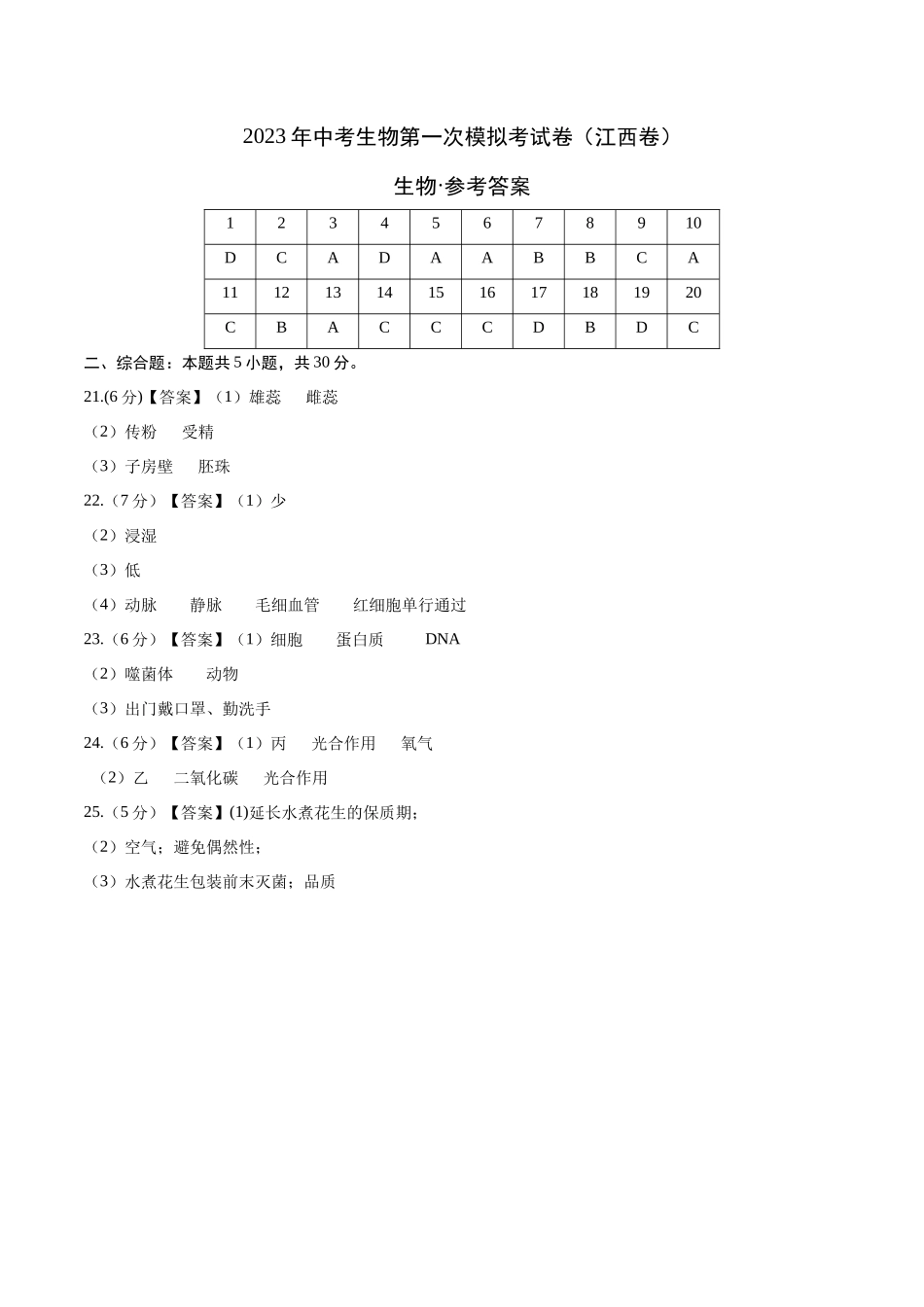 2023年中考生物第一次模拟考试卷(江西卷)生物·参考答案12345678910DCADAABBCA11121314151617181920CBACCCDBDC二、综合题:本题共5小题,共30分。21.(6分)【答案】(1)雄蕊雌蕊(2)传粉受精(3)子房壁胚珠22...