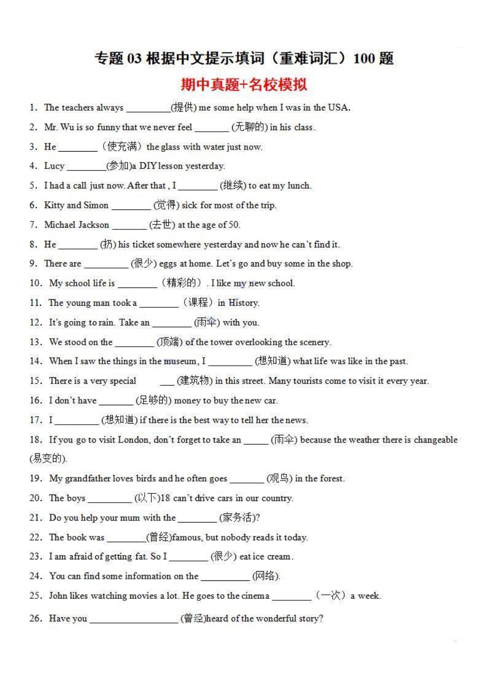 八年级英语上学期期中专题03 根据中文提示填词(重难词汇)100题(人教版)_八年级上册_八年级上册.pdf_第1页