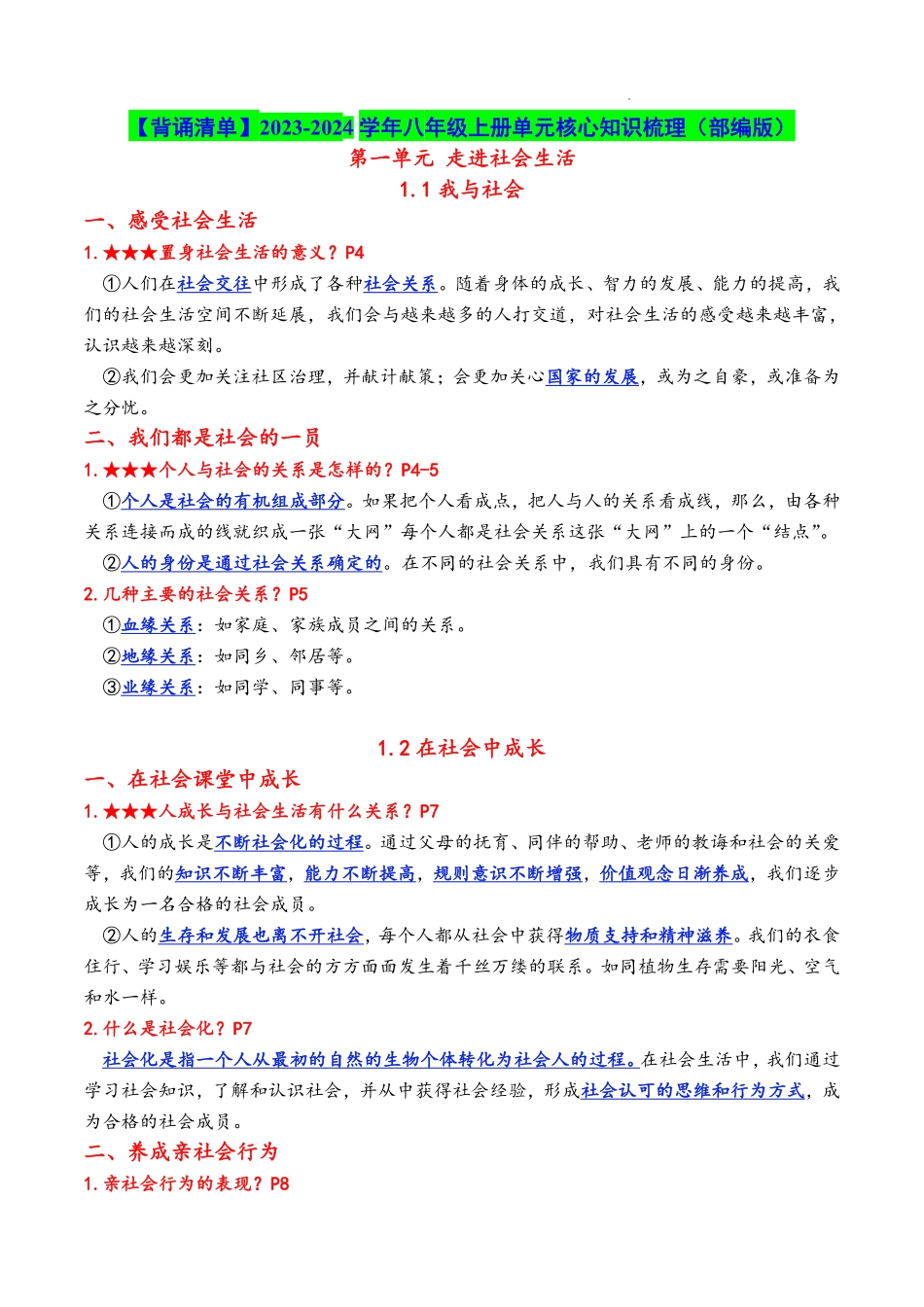 1.1我与社学年八年级上册单元核心知识梳理(部编版)第一单元走进社会生【背诵清单】2023-2024活会一、感受社会生活1.★★★置身社会生活的意义?P4①人们在社会交往中形成了各种社会关系。随着身体的成长、智力...