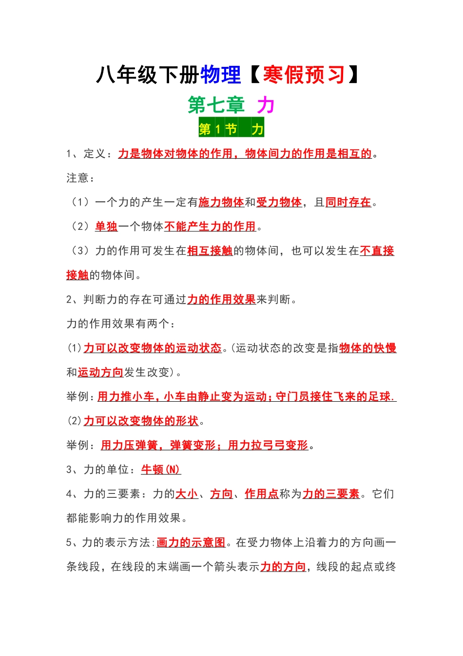 八年级下册物理【寒假预习】第七章力第1节力1、定义:力是物体对物体的作用,物体间力的作用是相互的。注意:(1)一个力的产生一定有施力物体和受力物体,且同时存在。(2)单独一个物体不能产生力的作用。(3)...