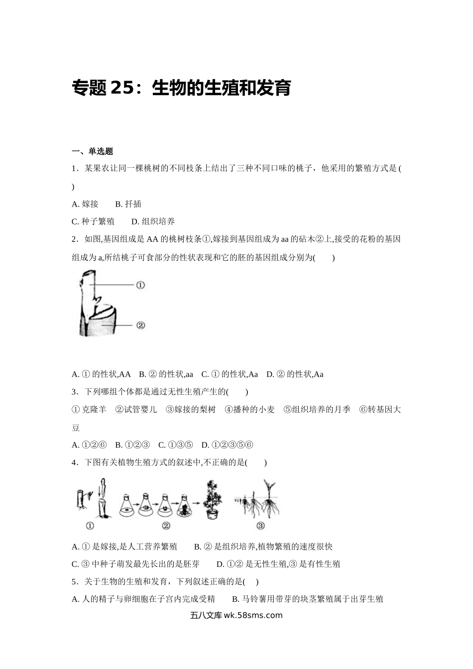 专题25:生物的生殖和发育一、单选题1.某果农让同一棵桃树的不同枝条上结出了三种不同口味的桃子,他采用的繁殖方式是()A.嫁接B.扦插C.种子繁殖D.组织培养2.如图,基因组成是AA的桃树枝条①,嫁接到基因组成为aa...