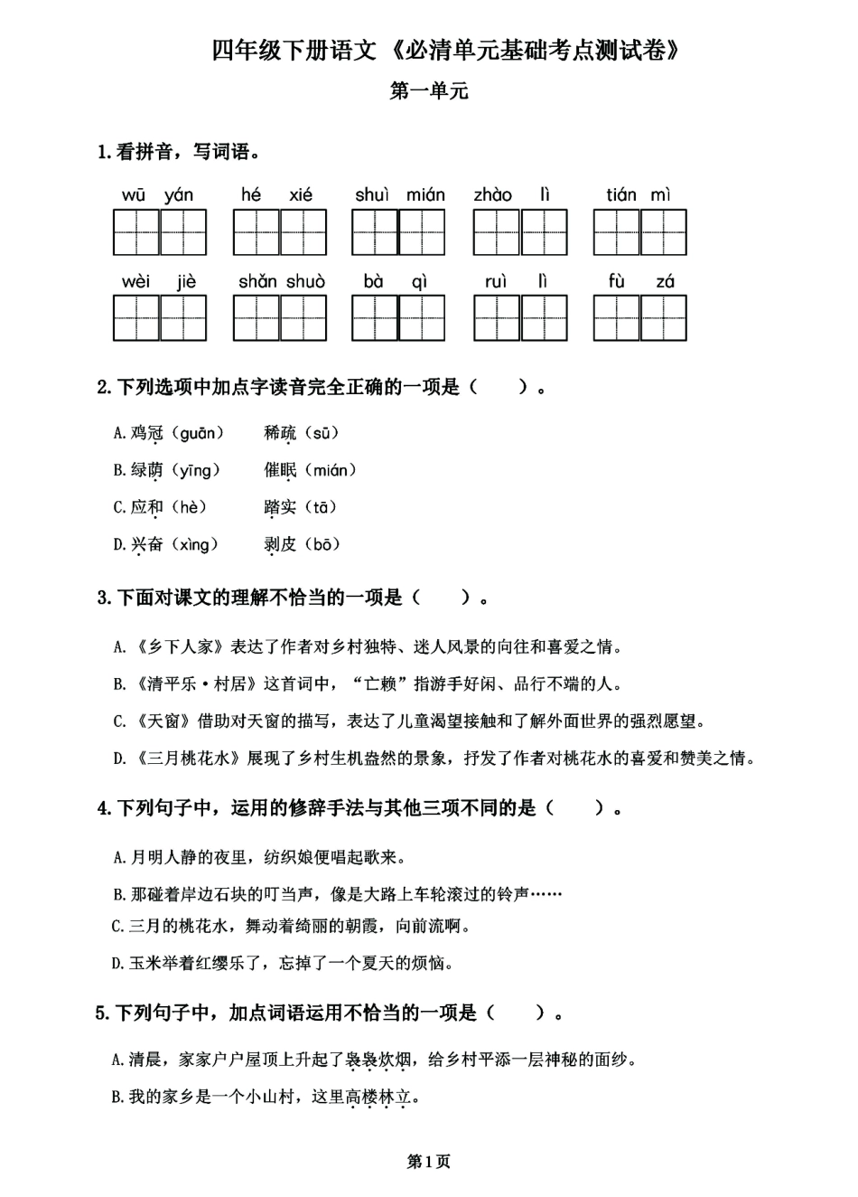 小学四年级下册四下语文《1-4单元必清基础考点测试卷》1.pdf