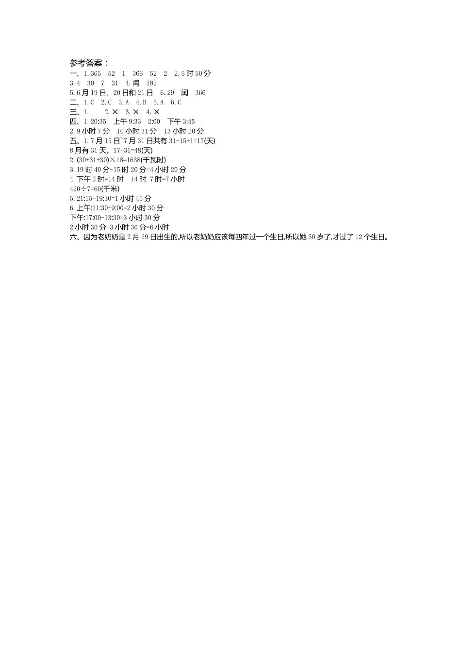 第三单元测试卷(时间:60分钟分数:)一、填空题。(17分)1.平年全年有()天,合()个星期,还剩()天;闰年全年有()天,合()个星期,还剩()天。2.一列火车从郑州开往天津,全程用7小时30分,如果火车从郑州出发时正好是22时20...