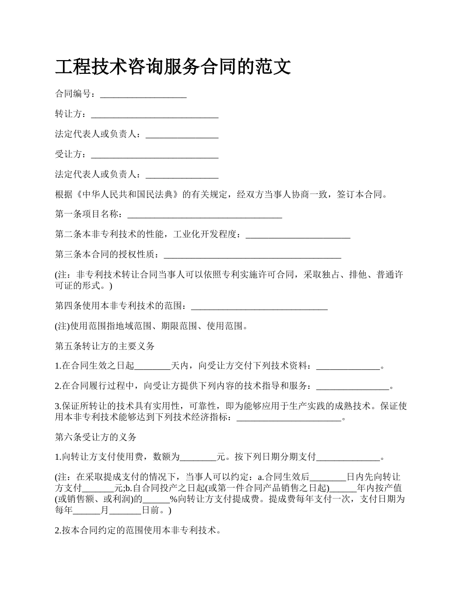 工程技术咨询服务合同的范文合同编号:___________________转让方:____________________________法定代表人或负责人:________________受让方:____________________________法定代表人或负责人:______________...