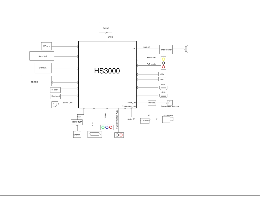 HS3000USB0USB1AV1--VideoAV1--AudioHDMI1Earohone/AvaudiooutPWM_L/RDRV632HDMI2ATBM8859TSINIFSerialTSSilicontunerIFQAM_P/NYPBPRYPBPR/AV2/VGAAudioVGAEthernetPHY/IP101ARMIISPDIFOUTDDR3X2SPIFlashNandflas...