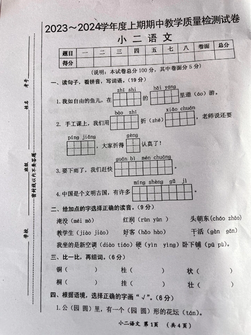 二年纪上册语文期中考试试卷。二年级上册语文 期中测试卷 二年级期中考试.pdf