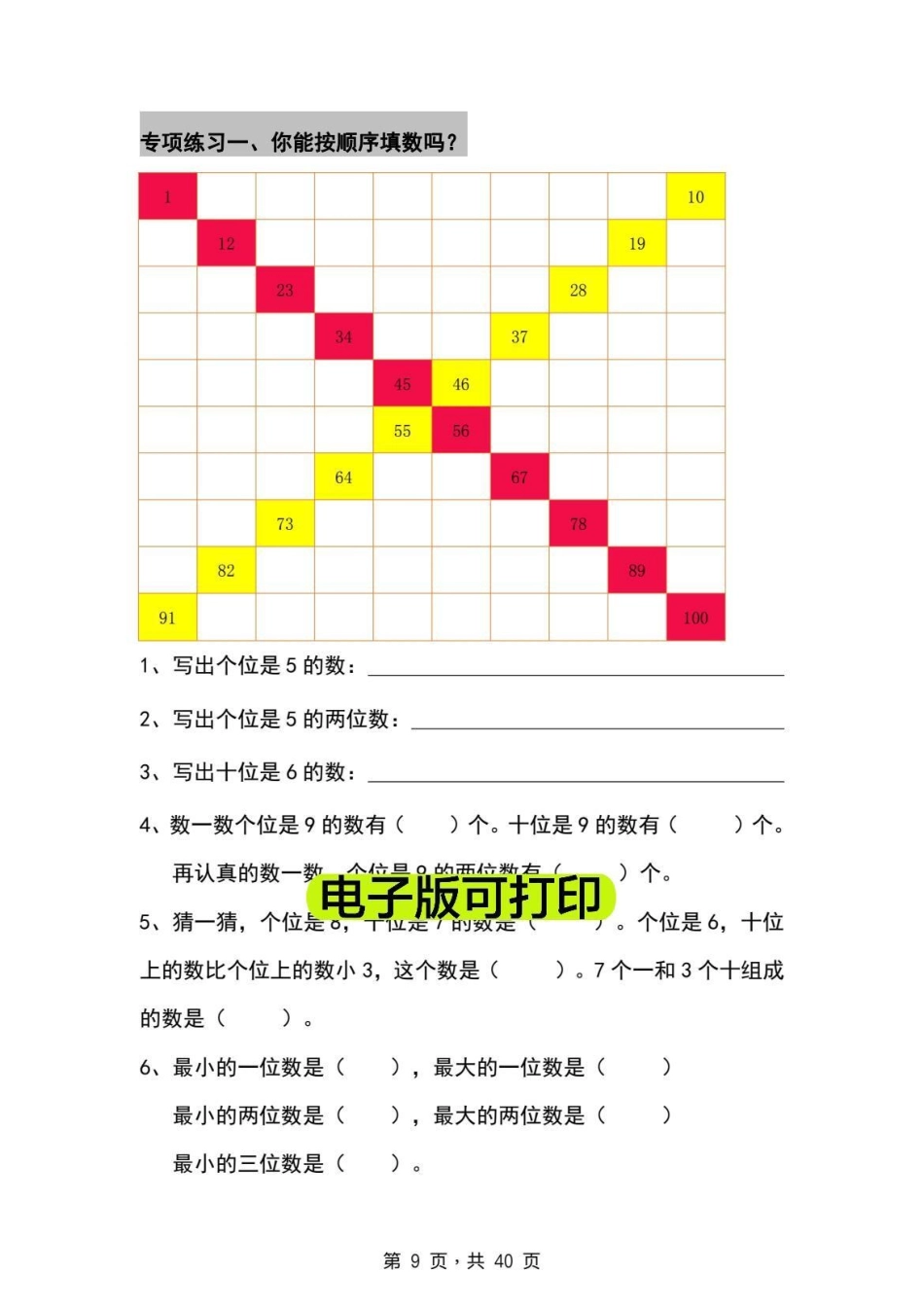 一年级数学下册,百数表专项练习。寒假充电计划 一年级重点知识归纳 数学一年级数学下册,百数表专项练习一年级数学下册必考题.pdf