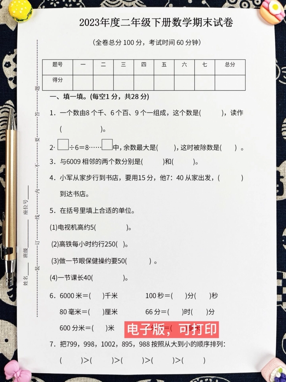 二年级数学下册期末检测卷,家长打印出来给。孩子做一做,找出薄弱的地方改正,争取拿到高分!二年级期末考试数学 期末考试试卷二年级数学下册.pdf