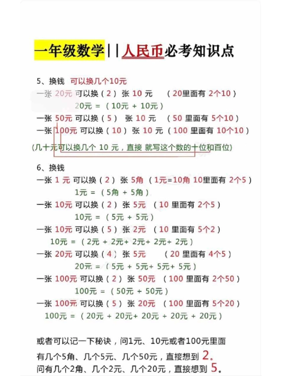 一年级下册数学人名币必考知识点归纳 教育 学习 知识点总结.pdf