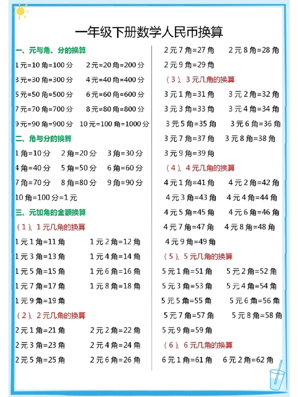 一年级下册数学人名币换算练习教育 知识点总结 小学数学 学霸秘籍.pdf