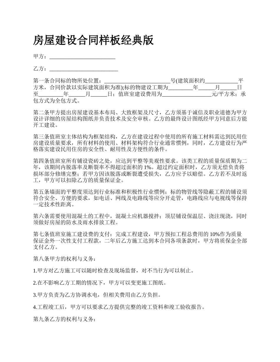 房屋建设合同样板经典版甲方:________________________乙方:_________________________第一条合同标的物所处位置:________________________号(建筑面积约____________平方米,合同价款以实际建筑面积为准);标...
