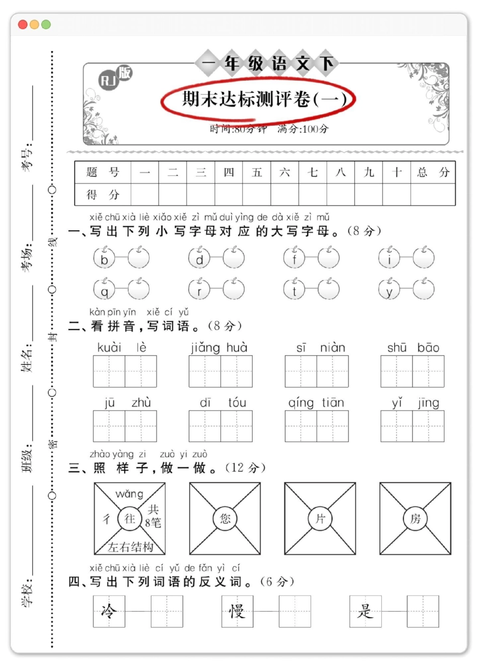 一年级语文下册期末达标测试卷。期末试卷 必考考点 知识点总结 期末测试卷 一年级语文下册期末测试卷.pdf_第1页