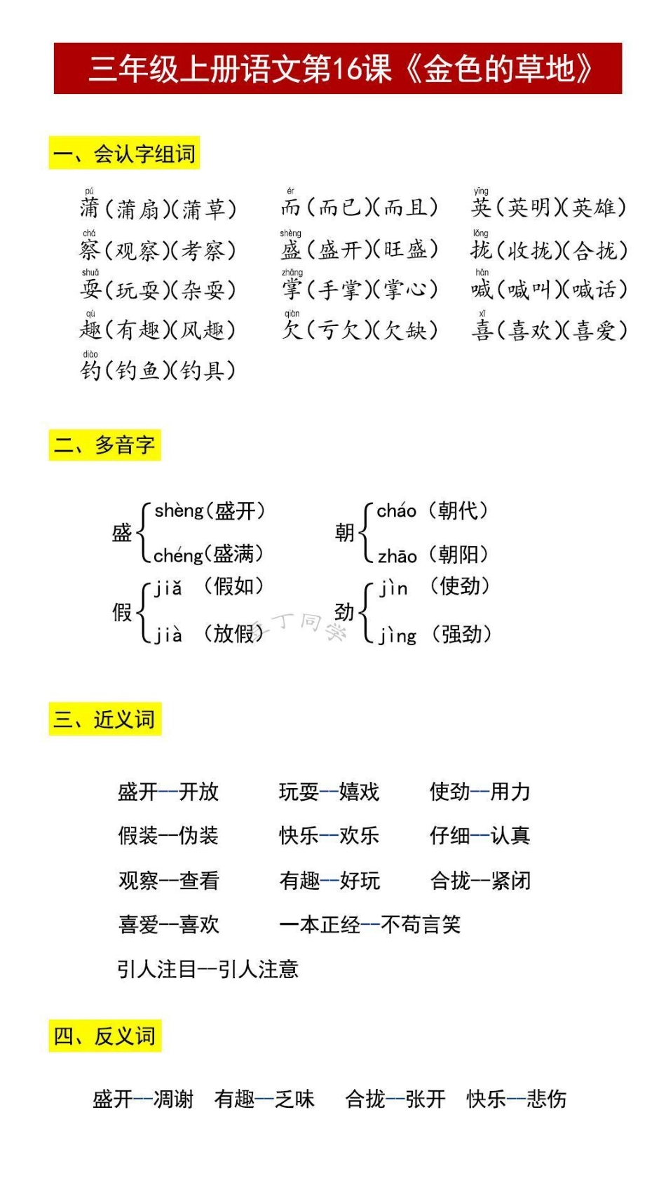三年级上册语文16课《金色的草地》词组,近,反.pdf_第1页