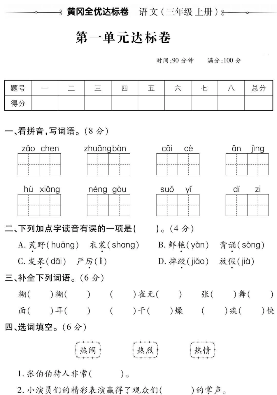三年级上册语文第一单元测试三年级语文必考考点 学习 大青树下的小学期中期末必考题易错题.pdf_第3页