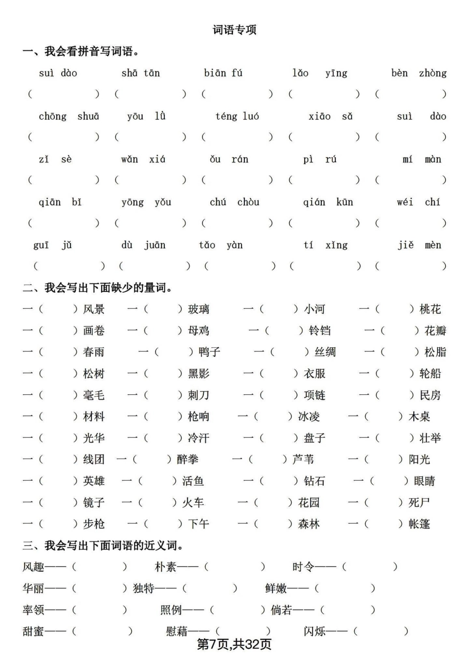 四年级下册语文期末基础复习~词语专项。四年级下册词语专项,整体偏简单,基础是关键。打印练习有答案!四年级下册语文 四年级下册语文重点考点复习 四年级下册语文期末复习 四年级下册语文看拼音写词语 词语专.pdf_第3页