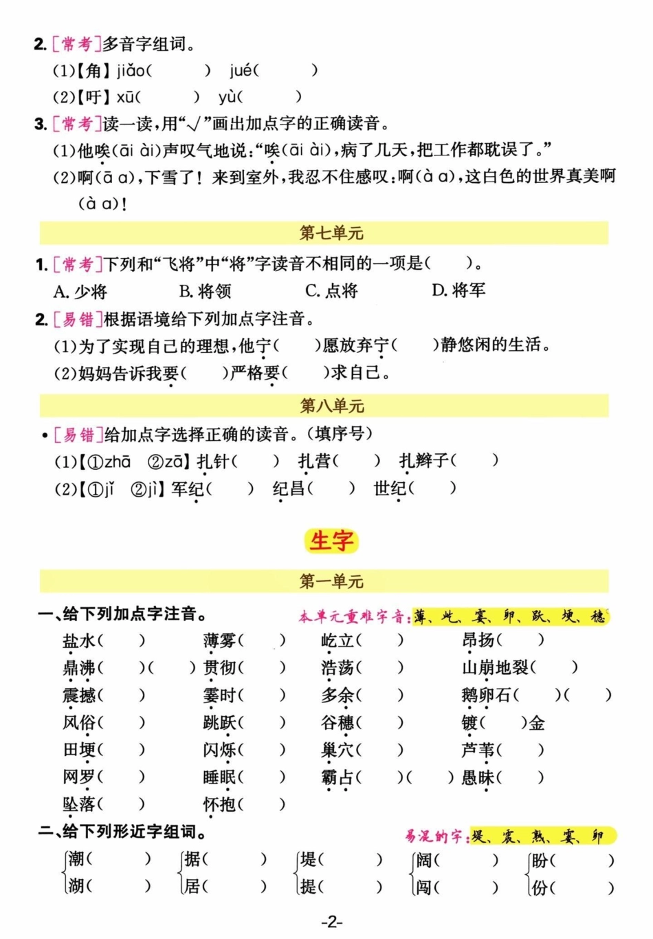 四年级语文上册单元生字及多音字。四年级上册语文 必考考点 期末复习 单元归类复习 专项训练 - 副本.pdf_第2页