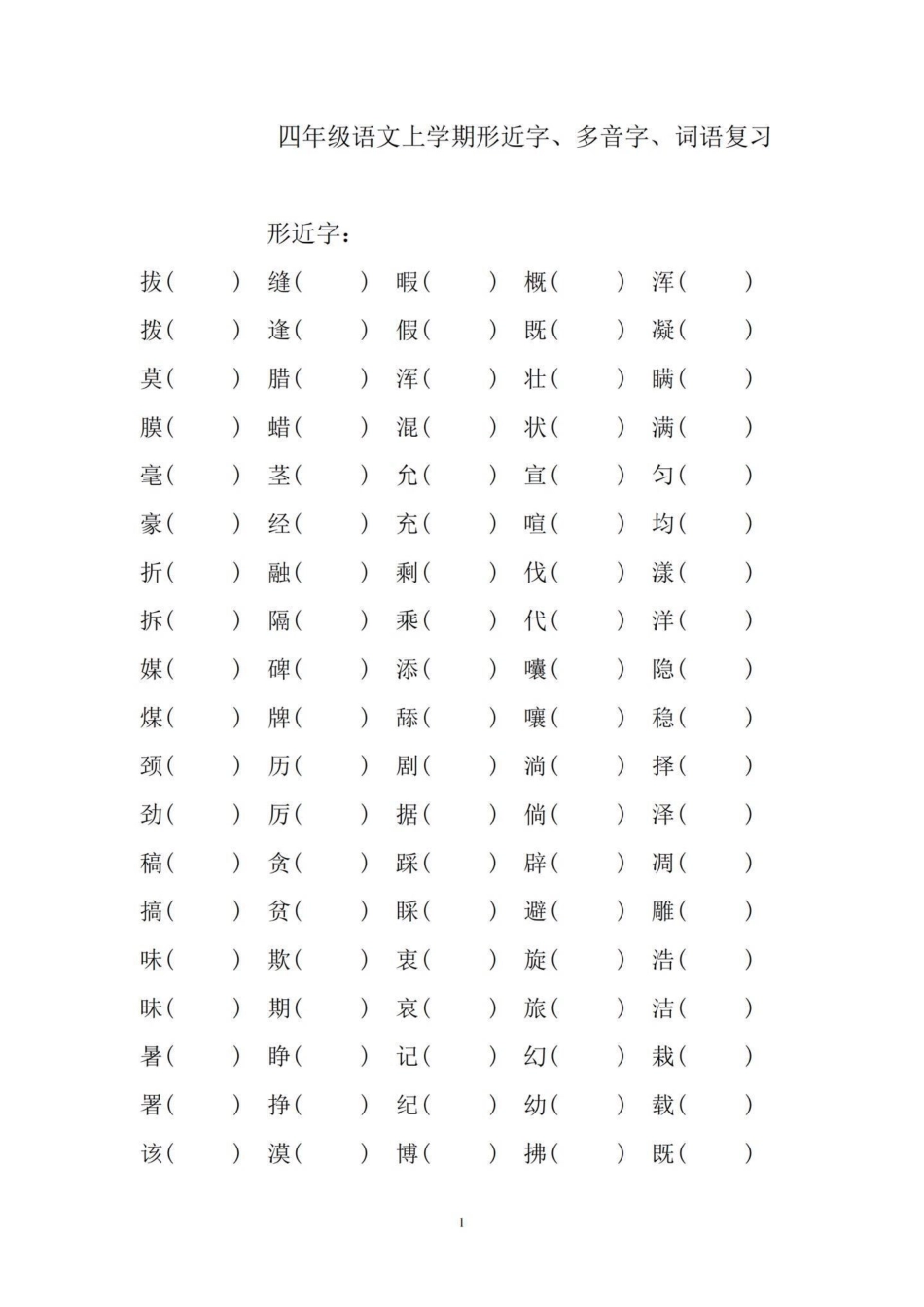 四年级语文上册形近字,多音字,词语总复习。四年级上册的全部形近字、多音字、词语搭配、“的得地”的区分、量词、四字词、近义词、反义词……汇总练习。可打印。有电子版,可打印四年级语文上册  小学语文怎么学.pdf_第1页