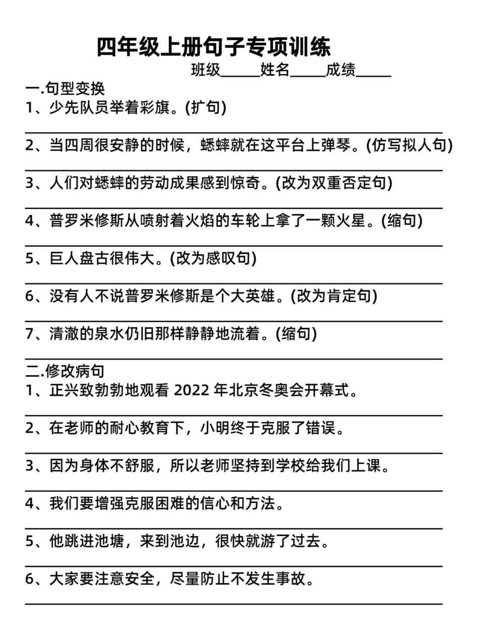 四年级语文上册重点句子专项训练(附答案)四年级重点句子专项训练,包括修改病句,反问句与陈述句,设问句,转述句,用关联词合并句子等,都是四年级上册常出现的题型。家长给孩子打印出来练习。四年级语文四年级上.pdf