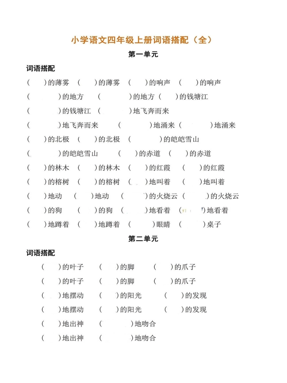 小学语文四年级上册词语搭配全单元练习。基础词语搭配,开发孩子想象力。完整电子版可打印。全册1-8单元词语搭配,给孩子打印出来学习吧!四年级语文上册生字组词 语文考点 日积月累 四年级语文上册.pdf_第1页