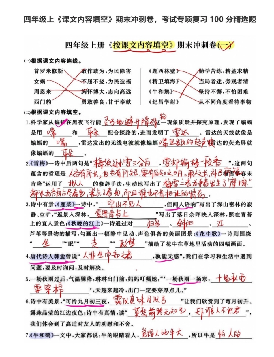 真全啊!四年级语文期末冲刺按课文内容填空。老师熬夜整理的四年级语文上册按课文内容填空,全册1-8单元重点核心考点。共18页附答案!打印出来练习,期末98分+童鞋们加油必考考点 四年级语文上册 四年级按.pdf_第1页