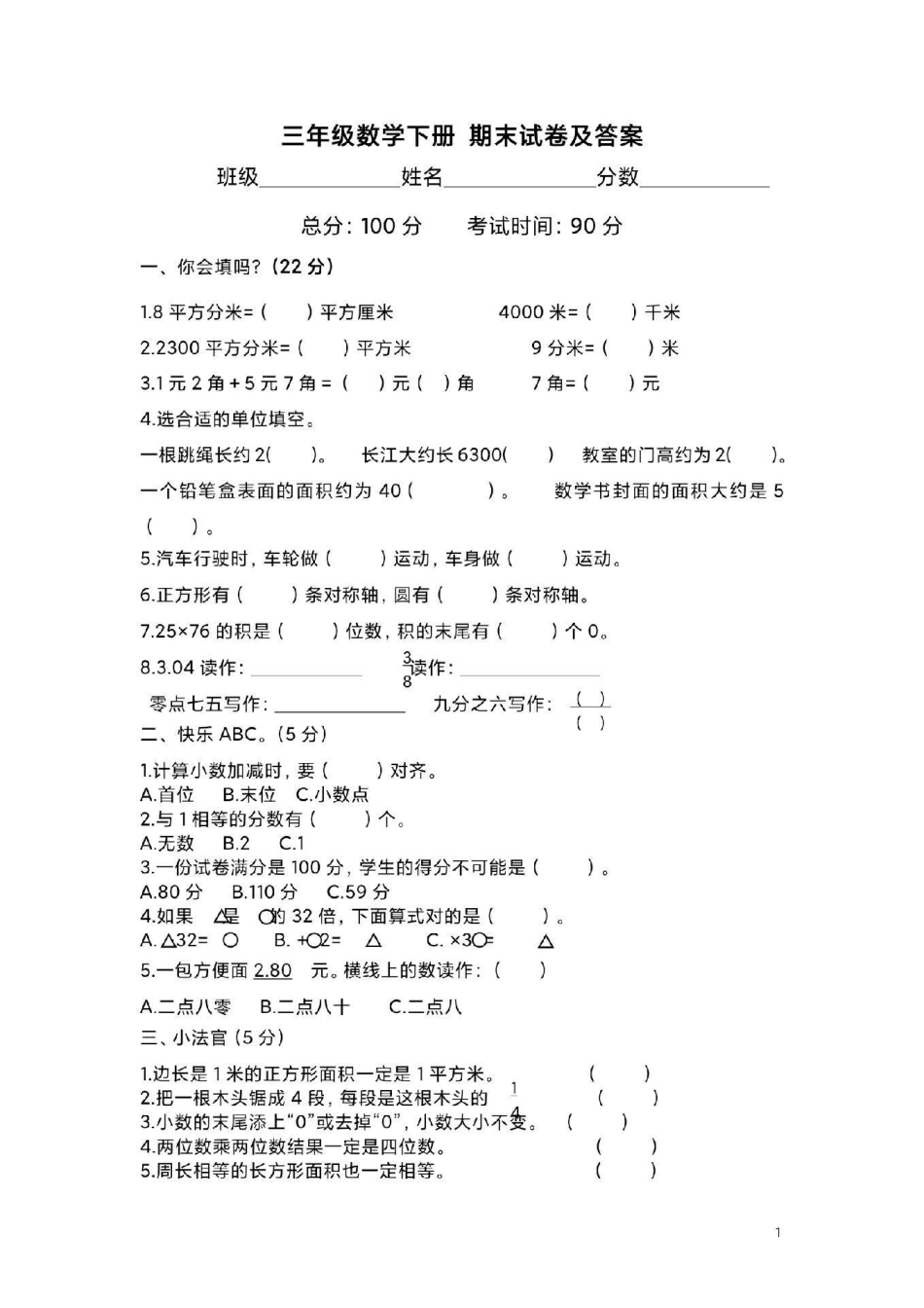 三年级下册数学期末试卷。三年级数学期末考试 必考考点 学习 教育.pdf_第1页