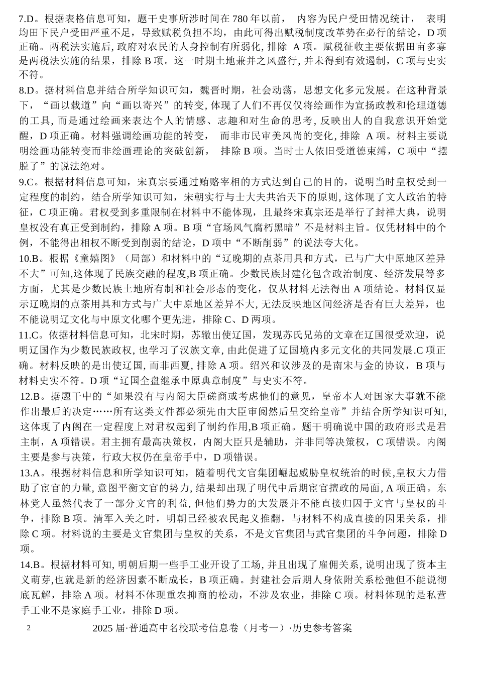 2025届·普通高中名校联考信息卷(月考一)·历史参考答案1.D。由材料可知,商王的祭祀系统有新旧两派,随着商王朝的扩张,新派祭祀杂收诸神,这表明在祭祀方面,商人已经摆脱原有族群局限,向多族群融合的方向发展...