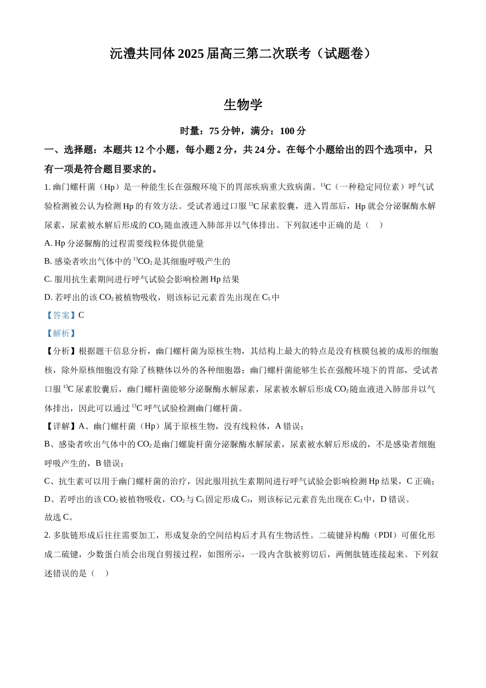 沅澧共同体2025届高三第二次联考(试题卷)生物学时量:75分钟,满分:100分一、选择题:本题共12个小题,每小题2分,共24分。在每个小题给出的四个选项中,只有一项是符合题目要求的。1.幽门螺杆菌(Hp)是一种...