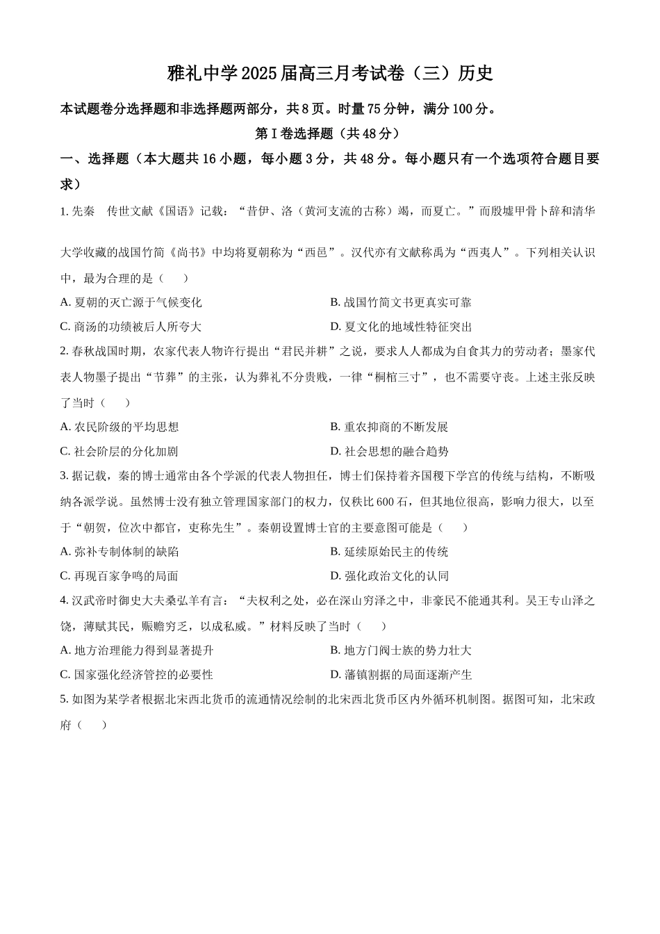 雅礼中学2025届高三月考试卷(三)历史本试题卷分选择题和非选择题两部分,共8页。时量75分钟,满分100分。第I卷选择题(共48分)一、选择题(本大题共16小题,每小题3分,共48分。每小题只有一个选项符合题目要...