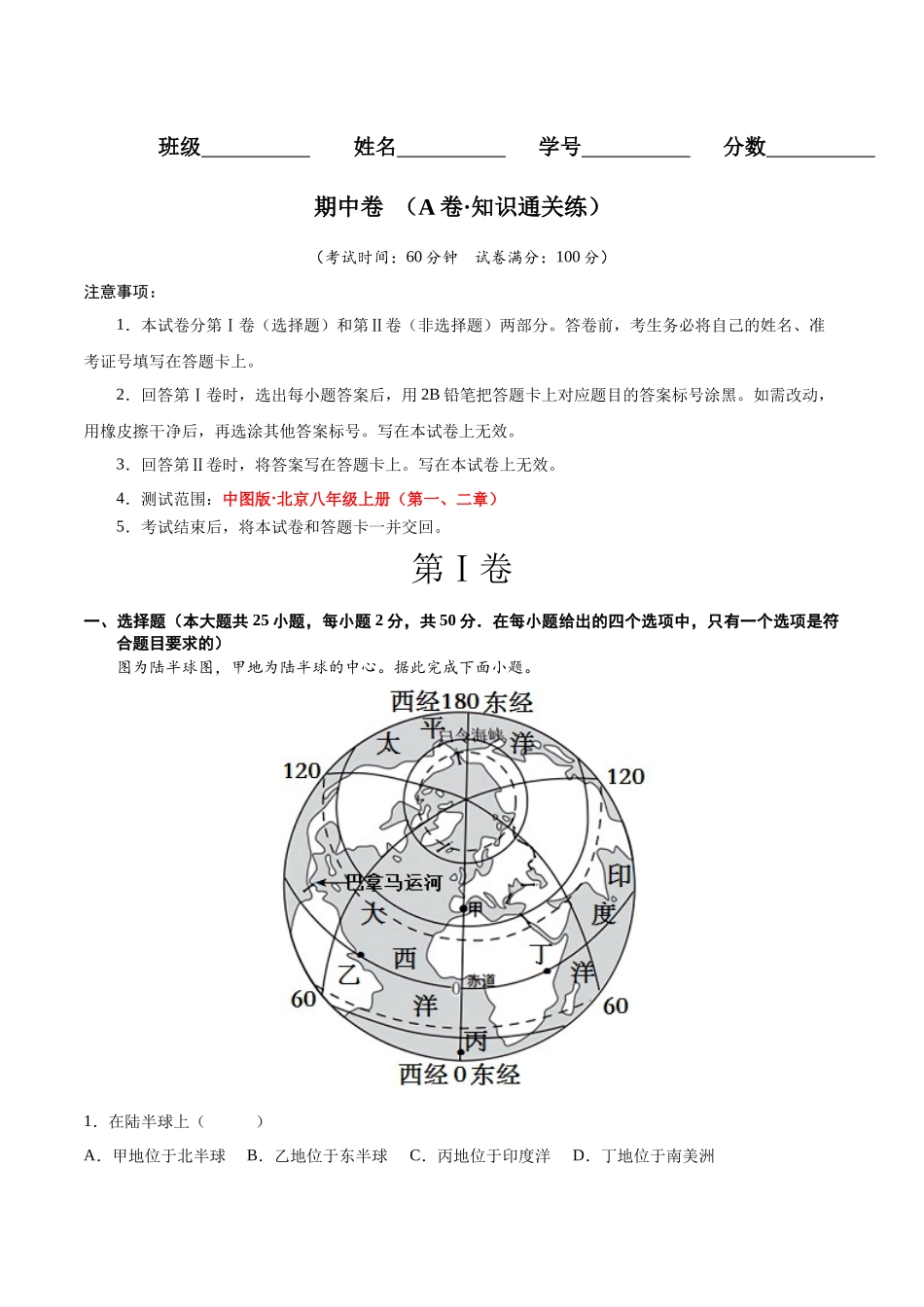 班级姓名学号分数期中卷(A卷·知识通关练)(考试时间:60分钟试卷满分:100分)注意事项:1.本试卷分第Ⅰ卷(选择题)和第Ⅱ卷(非选择题)两部分。答卷前,考生务必将自己的姓名、准考证号填写在答题卡上。2...