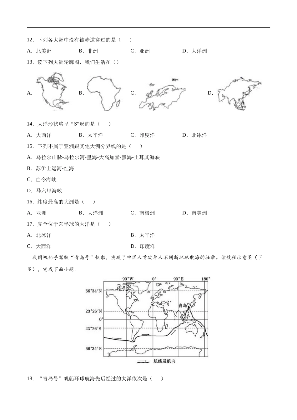【七年级上册地理】2.1大洲和大洋-课后培优练(人教版)(原卷版).docx