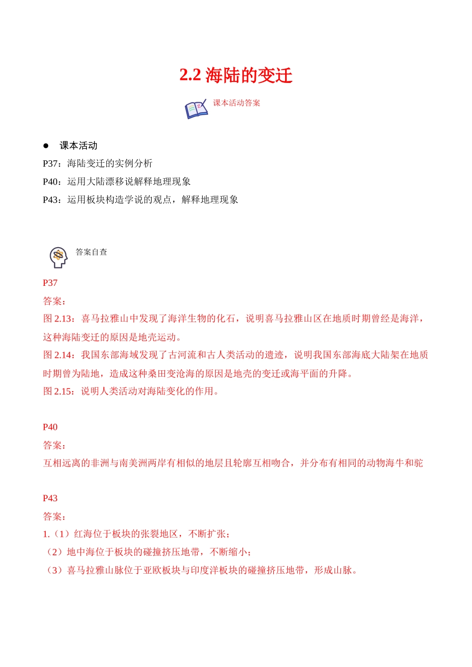 课本活动答案答案自查2.2海陆的变迁课本活动P37:海陆变迁的实例分析P40:运用大陆漂移说解释地理现象P43:运用板块构造学说的观点,解释地理现象P37答案:图2.13:喜马拉雅山中发现了海洋生物的化石,说明喜马...
