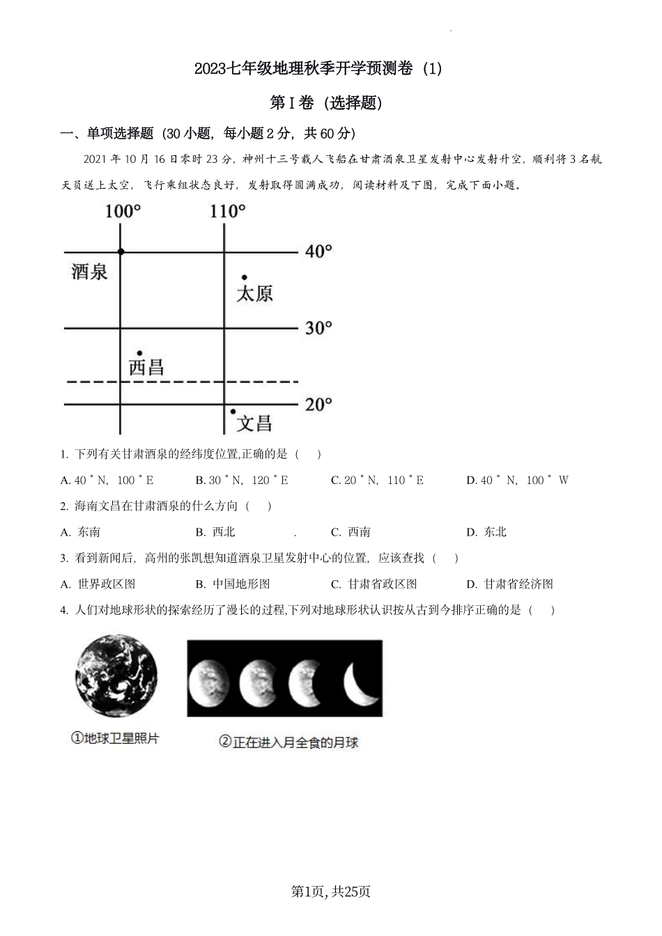 学科网(北京)股份有限公司第I卷(选择题)一、单项选择题(30小题,每小题2分,共60分2023七年级地理秋季开学预测卷(1))2021年10月16日零时23分,神州十三号载人飞船在甘肃酒泉卫星发射中心发射升空,顺利将...