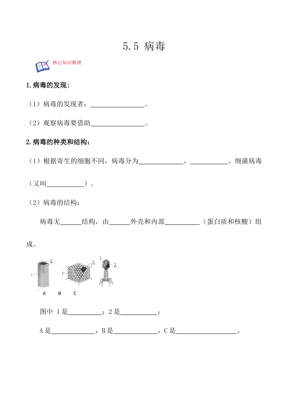核心知识梳理ABC5.5病毒1.病毒的发现:(1)病毒的发现者:。(2)观察病毒要借助。2.病毒的种类和结构:(1)根据寄生的细胞不同,病毒分为、、细菌病毒(又叫)。(2)病毒的结构:病毒无结构,由外壳和内部(蛋...