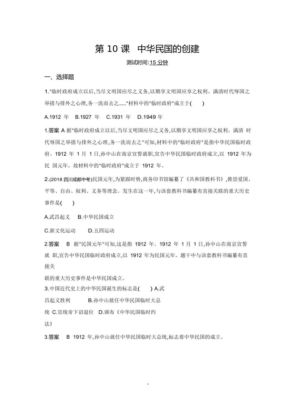 1第10课中华民国的创建测试时间:15分钟一、选择题1.“临时政府成立以后,当尽文明国应尽之义务,以期享文明国应享之权利。满清时代辱国之举措与排外之心理,务一洗而去之……”材料中的“临时政府”成立于()A.1912年...