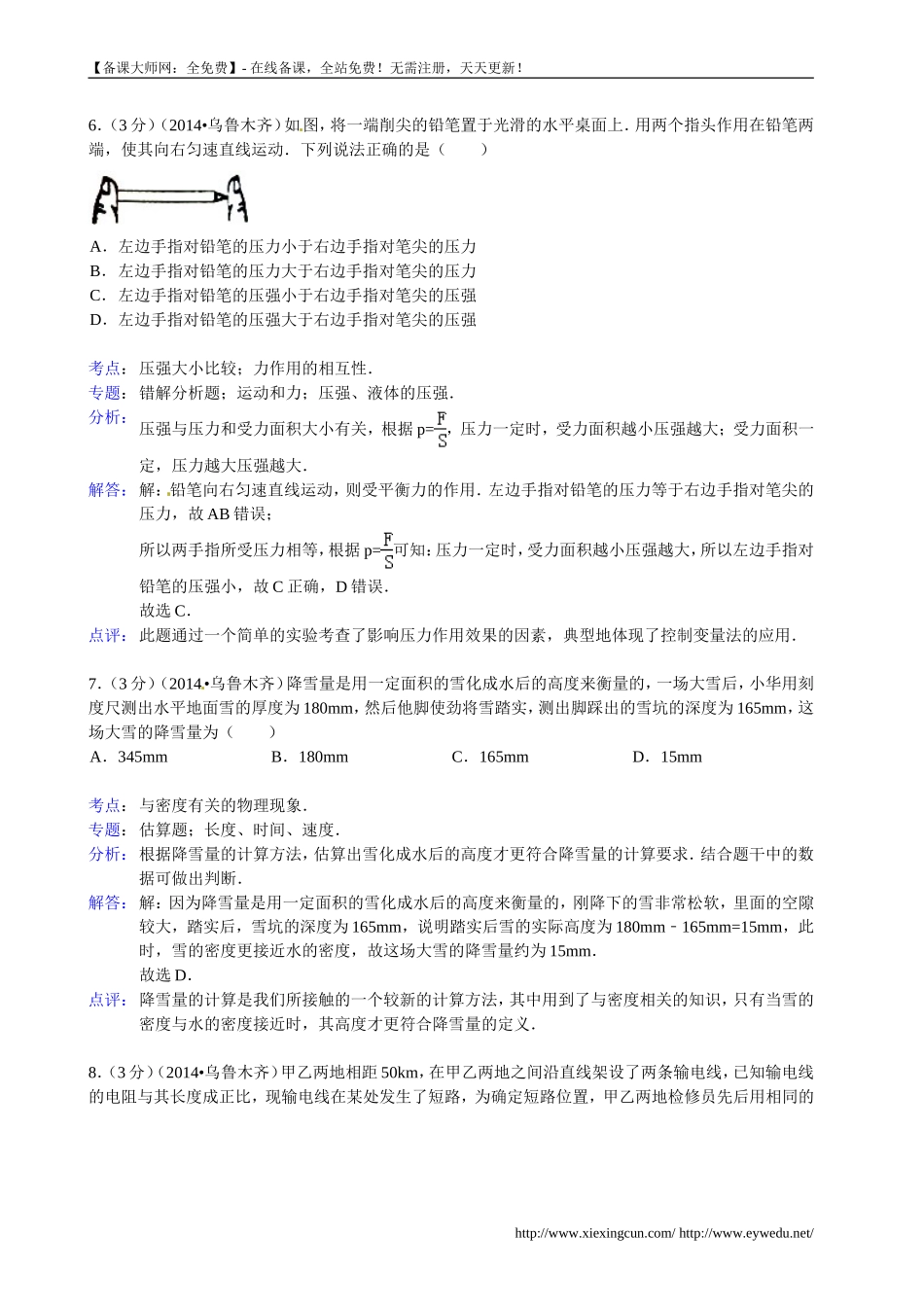 【备课大师网:全免费】-在线备课,全站免费!无需注册,天天更新!2014年新疆乌鲁木齐中考物理试卷参考答案与试题解析一、选择题(本题10小题,每题3分,共30分.每小题4个选项,其中有一个是符合题意的,选对得...
