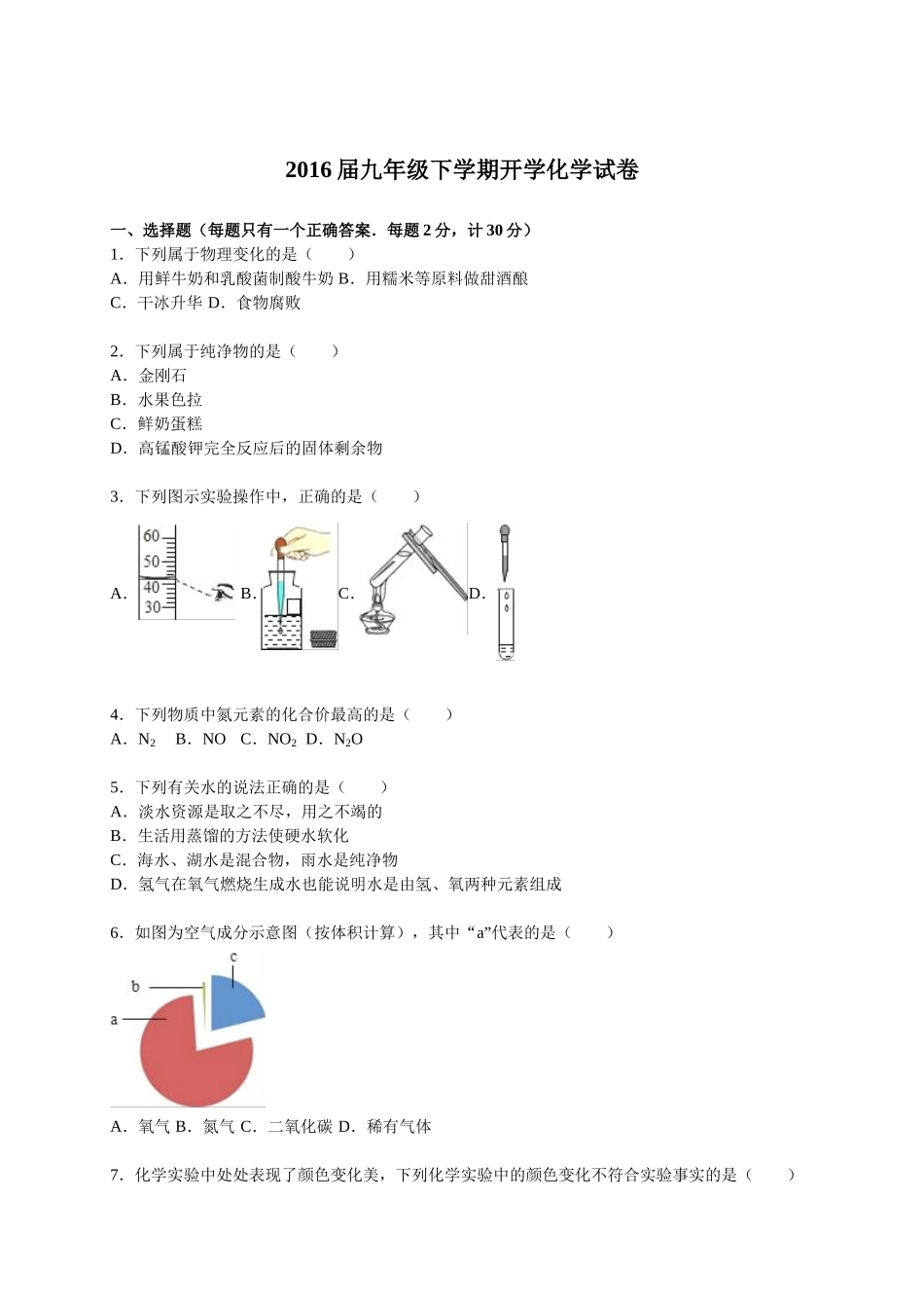 2016届九年级下学期开学化学试卷一、选择题(每题只有一个正确答案.每题2分,计30分)1.下列属于物理变化的是()A.用鲜牛奶和乳酸菌制酸牛奶B.用糯米等原料做甜酒酿C.干冰升华D.食物腐败2.下列属于纯净物...