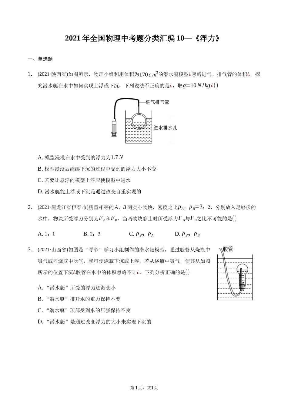 2021年全国物理中考题分类汇编10—《浮力》一、单选题1.(2021·陕西省)如图所示,物理小组利用体积为170cm3的潜水艇模型¿忽略进气、排气管的体积¿,探究潜水艇在水中如何实现上浮或下沉,下列说法不正确的是¿...