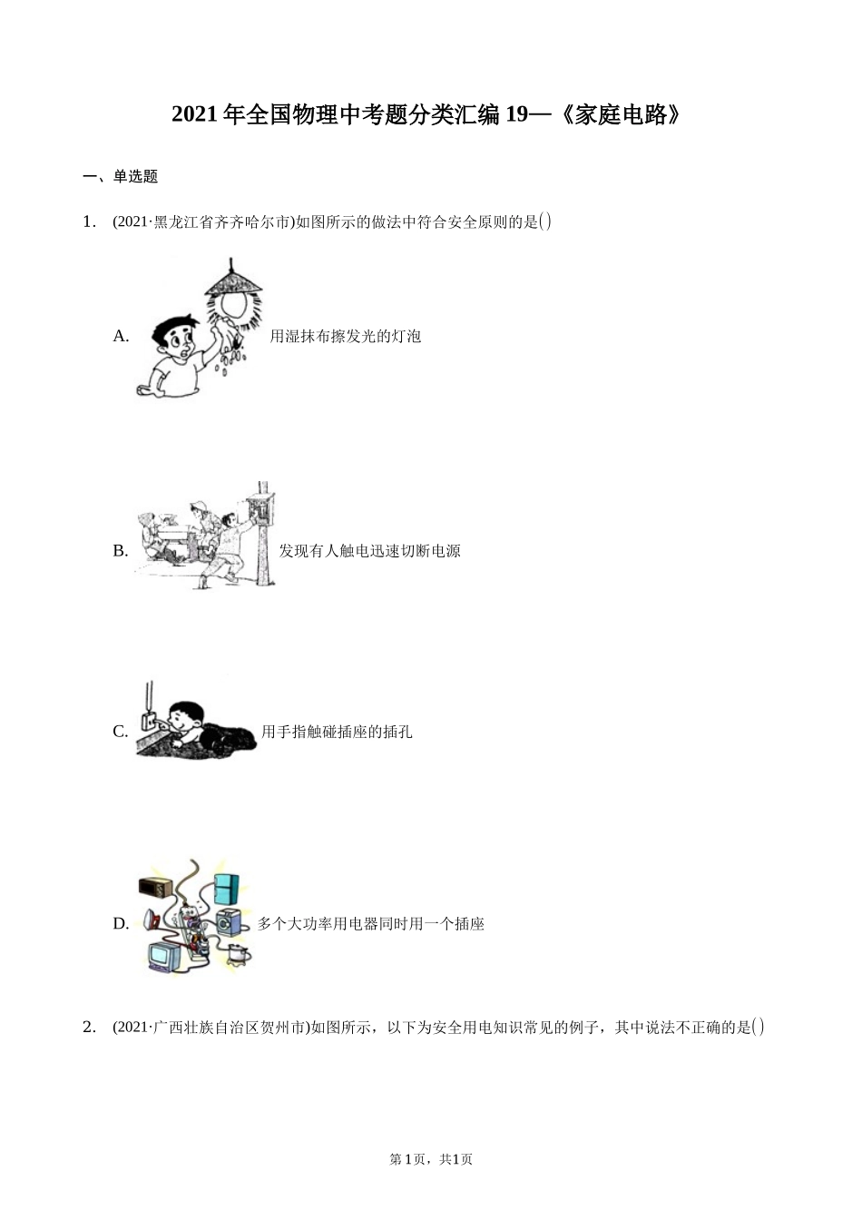2021年全国物理中考题分类汇编19—《家庭电路》一、单选题1.(2021·黑龙江省齐齐哈尔市)如图所示的做法中符合安全原则的是()A.用湿抹布擦发光的灯泡B.发现有人触电迅速切断电源C.用手指触碰插座的插孔D.多个大功...